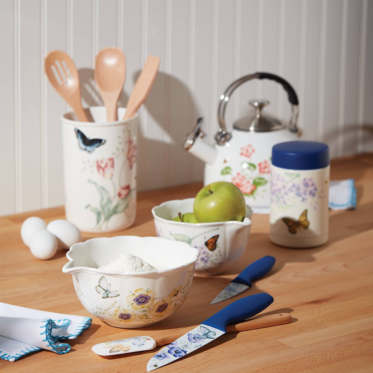 Crafted of durable stainless steel. the Butterfly Meadow Large Insulated Food Container features double-wall insulation that is sure to keeps its contents warm for up to four hours. This item features a motif of butterflies and flowers on its sides. and a handsome blue lid. Hand washing this item is recommended.