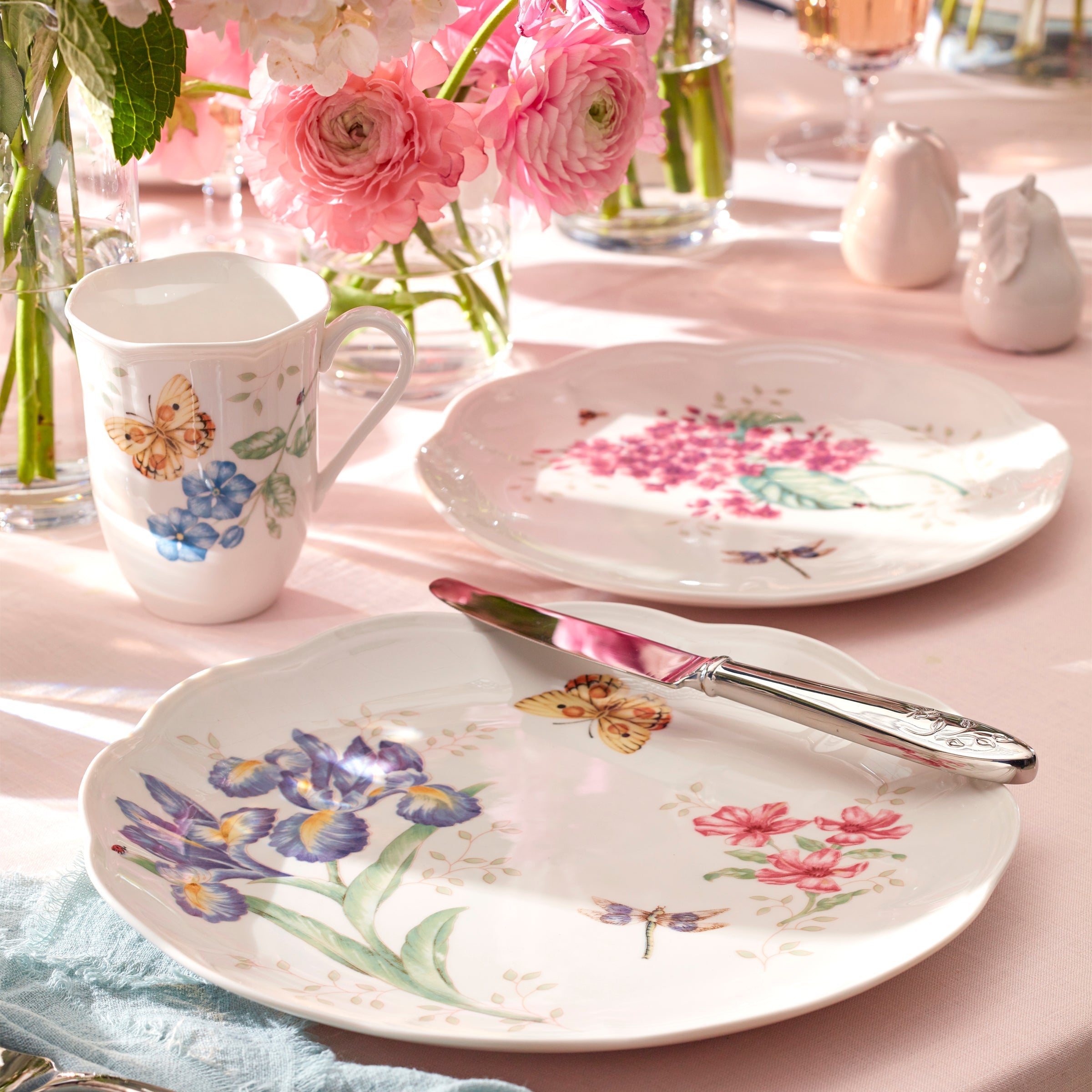 Lively blue blossoms tempt a colorful orange sulphur butterfly amidst motifs of light-palate foliage. Crafted from durable ceramic porcelain with scalloped edges and a petite handle. the Butterfly Meadow Orange Sulphur Mug is dishwasher and microwave-safe for a charming and functional kitchen addition.