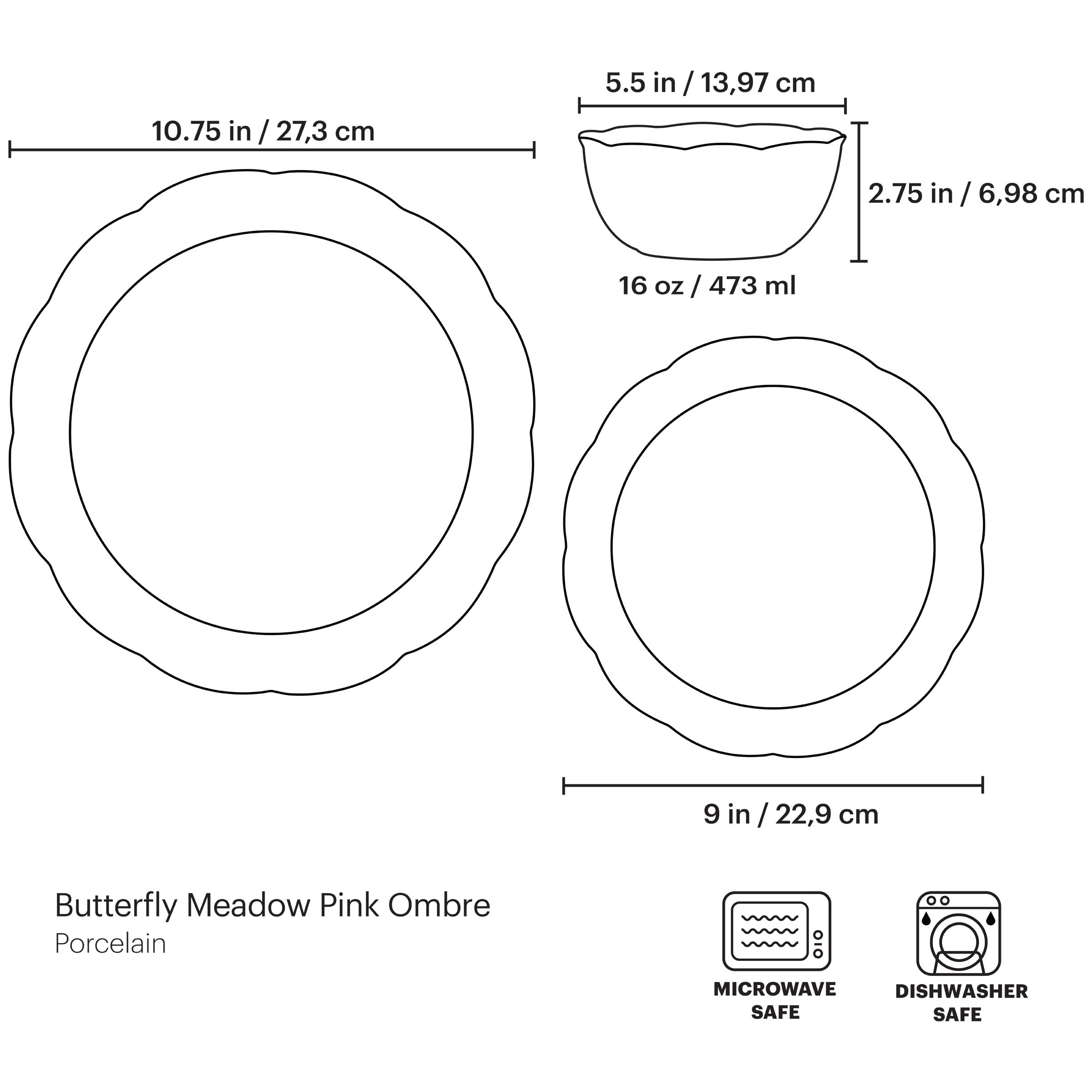 Pretty as a picture??made to mix and match. This fresh addition to our #1 best-selling Butterfly Meadow Collection is as lively and lovely as a picnic-perfect day. Pink Ombre dinnerware preserves snapshots of spring within a blushing border. Dishwasher- and microwave-safe porcelain.