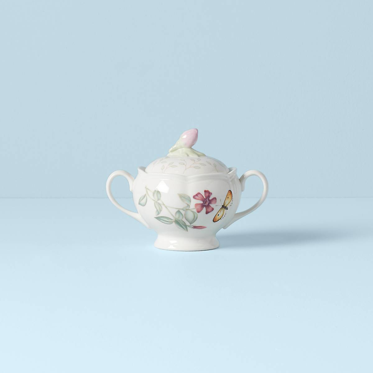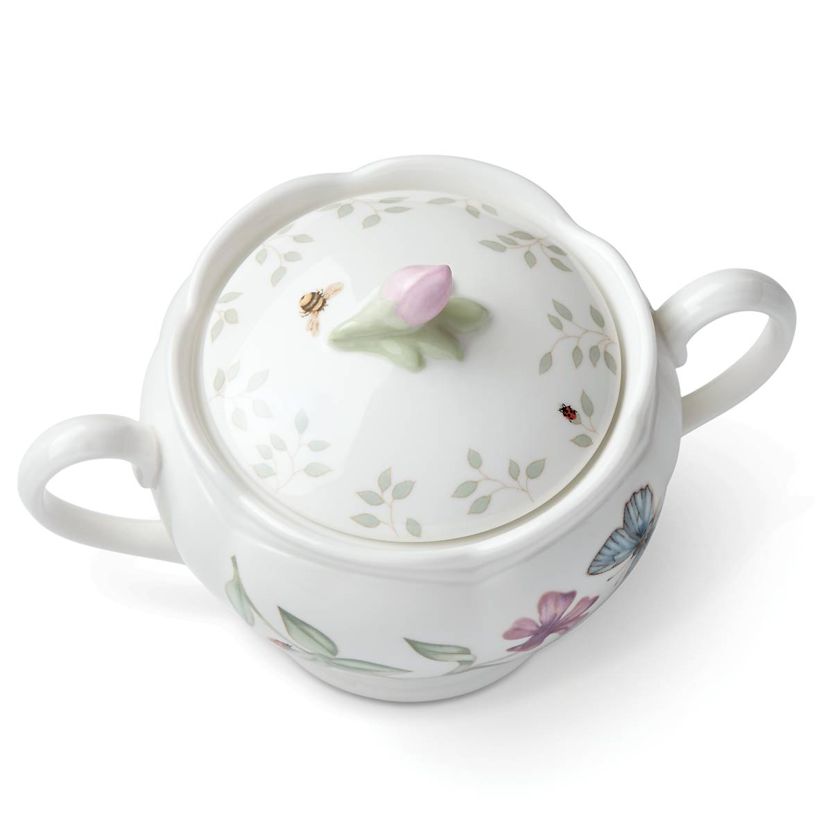 A sculpted pink flower forms a charming finial on the lid of the Butterfly Meadow Sugar Bowl. Two handles on either side boast an elegant contour. while the Butterfly Meadow’s classic garden illustrations take the stage across the durable white ceramic porcelain surface. This sugar bowl is dishwasher and microwave-safe.