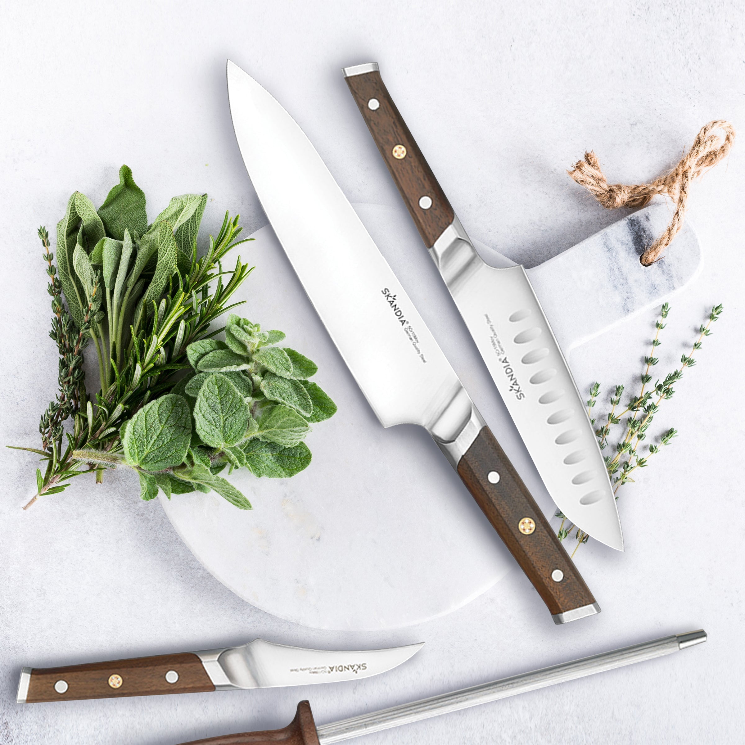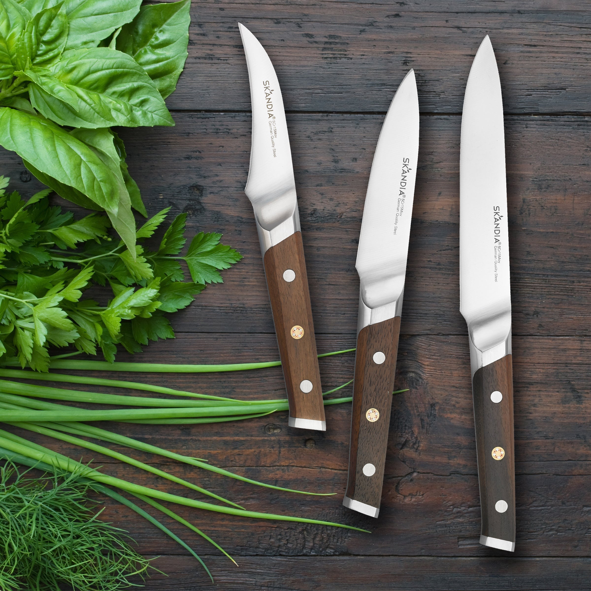 Bring the retro sophistication of natural acacia wood to your prep scene with the Harley 14 Piece Cutlery Block Set by Skandia. Each knife is made from German-quality stainless steel and is fitted with a beautiful triple-riveted. carbonized acacia wood handle. providing signature rustic appeal. beautiful subtle color variation. and superior sharpness. For that added artisanal accent. this set features a prominent accented copper rivet design and comes in an attractive acacia wood knife block for safekeeping. great countertop presence. and that touch of the outdoors.
