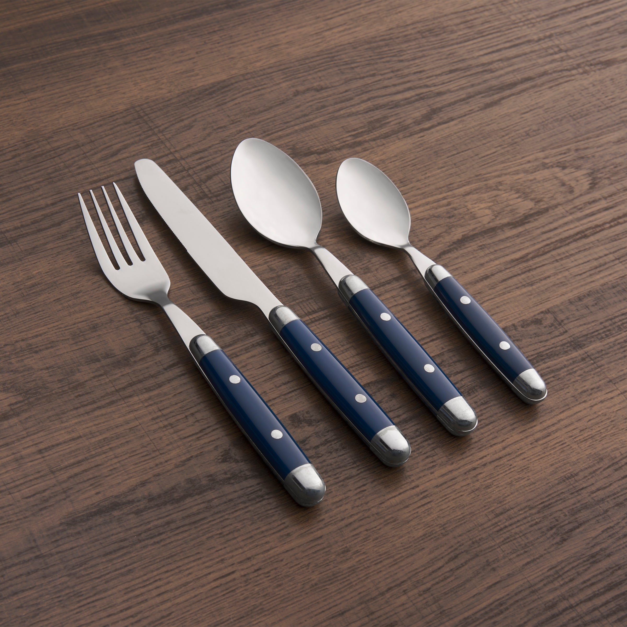 16-piece service for 4 forged using high-quality stainless steel. Features a pleasant retro look. comfortable blue oval handles with stout rivets. and smoothly integrated metal tips.
