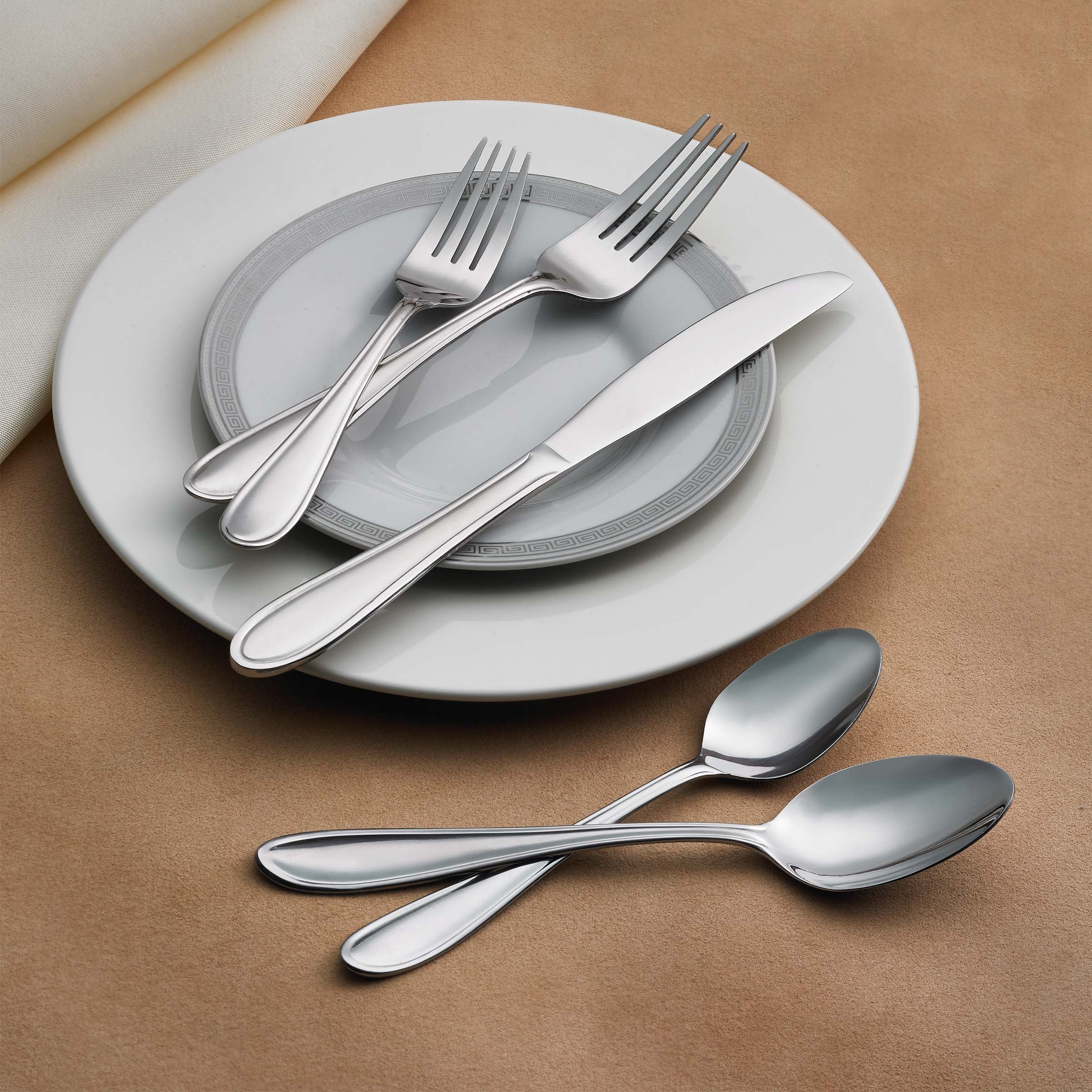 A contemporized classic. the Lincoln Flatware Set by Hampton Forge features a teardrop handle with gentle fluted edging to complement its shape. Crafted from premium stainless steel and polished to a brilliant mirror finish. the charming. simple design of Lincoln adds a touch of character and refinement to the table.