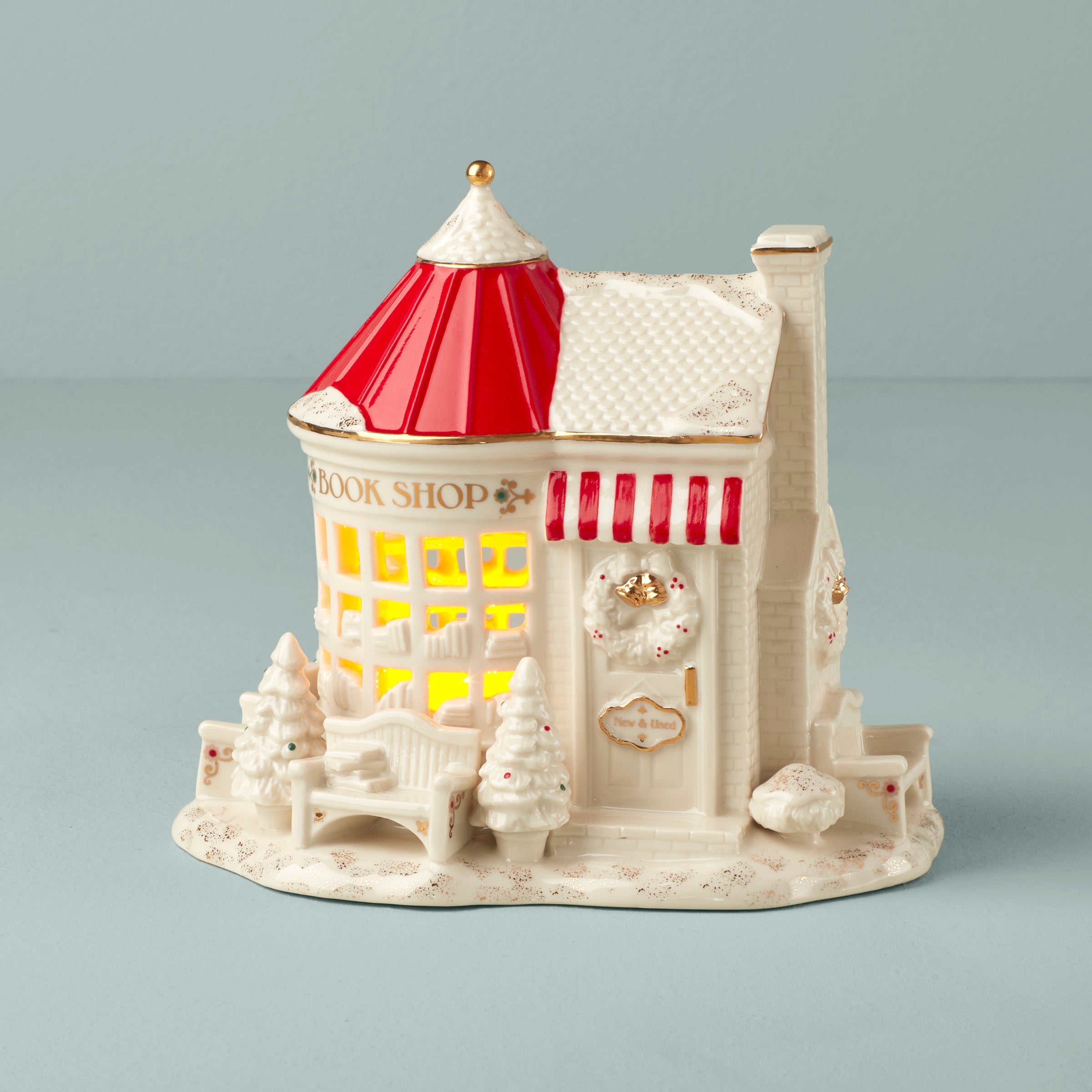 This light-up figurine is crafted in creamy porcelain and is softly illuminated from the inside to create a cozy atmosphere. Showcasing a cozy book store decorated with 24k gold accents to create a glowing seasonal atmosphere in your home. It’s a charming addition to your Mistletoe Park Village Traditions collection.