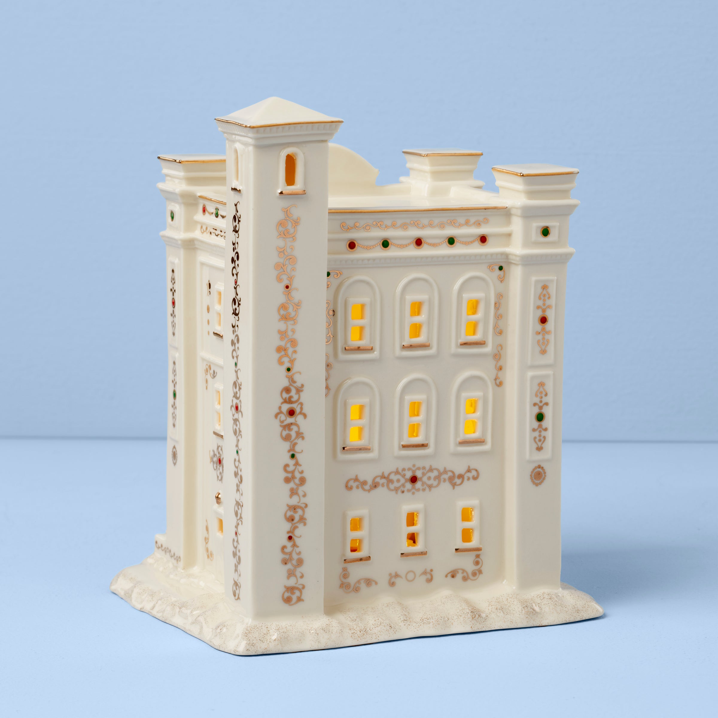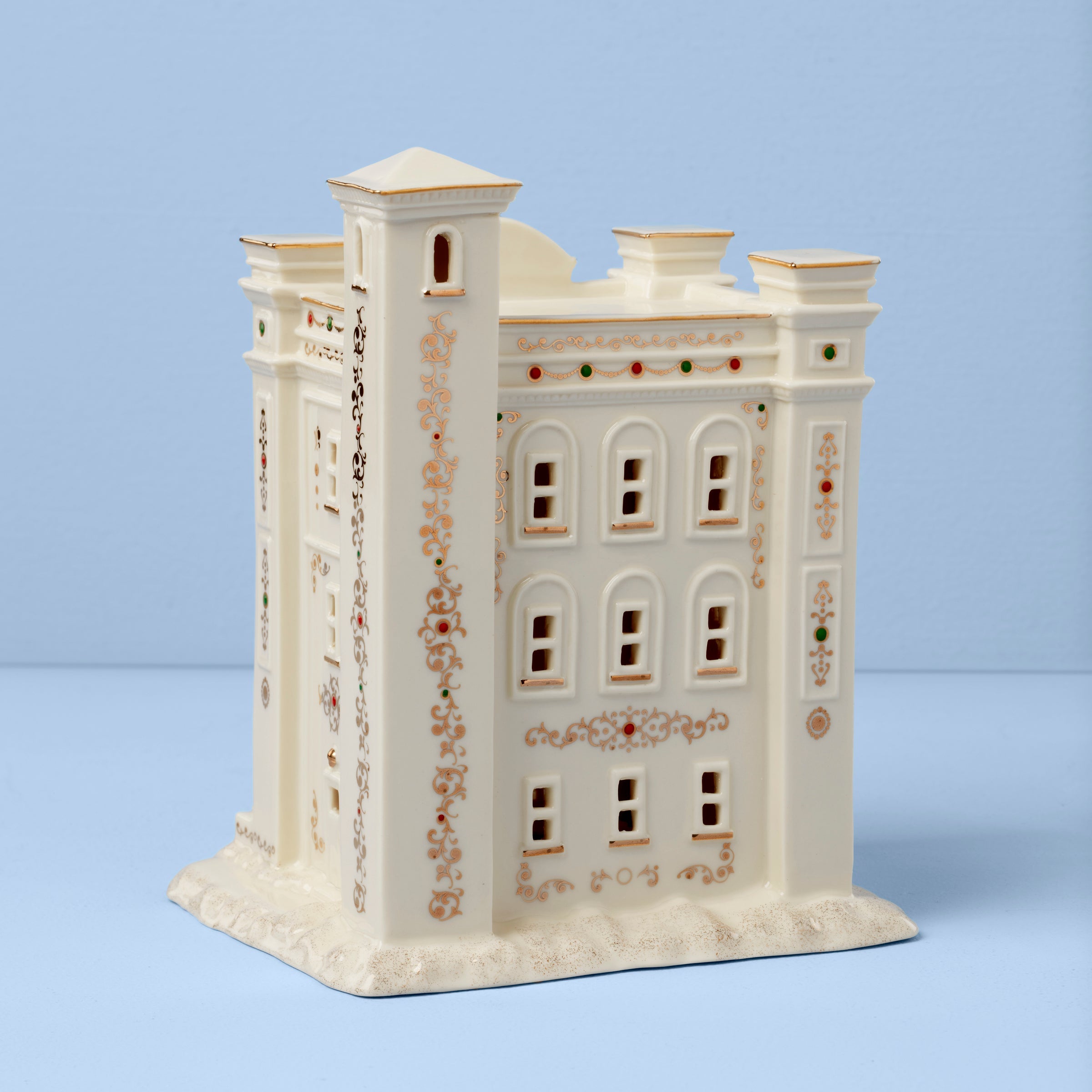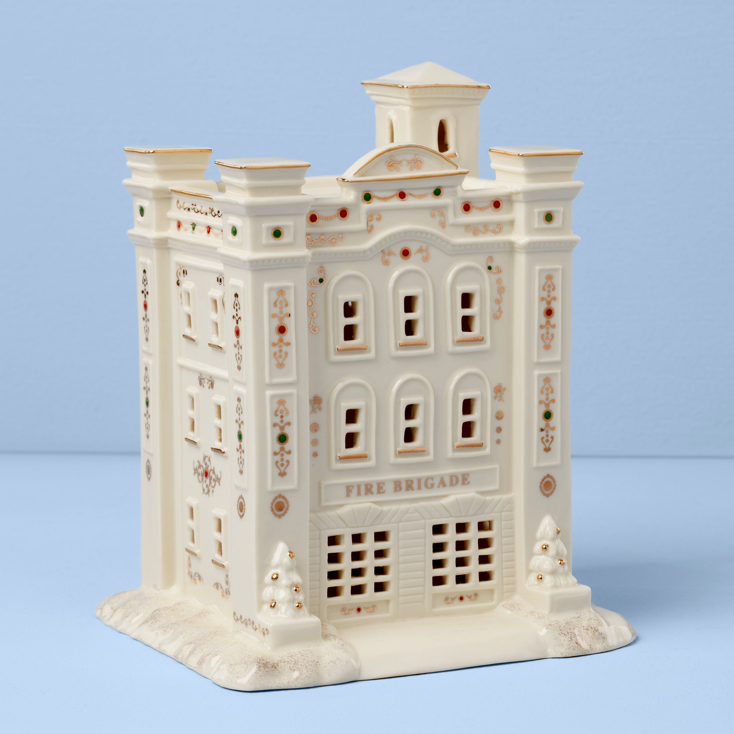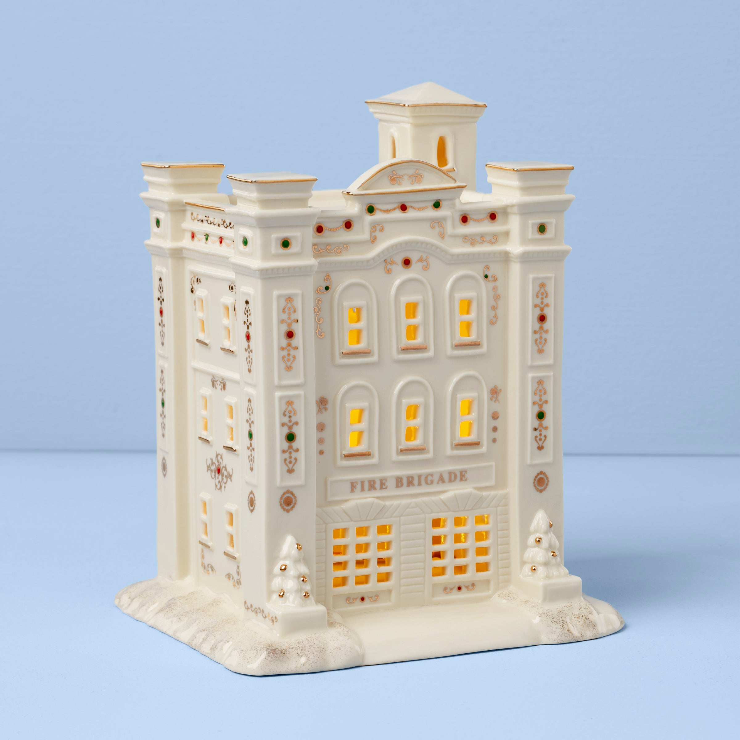 This light-up fire house figurine is crafted in creamy porcelain and is softly illuminated from the inside to create a cozy atmosphere. It’s hand-decorated with 24k gold accents for a shining finish. A truly charming addition to your Mistletoe Park Village Traditions collection. or any Christmas mantel display!