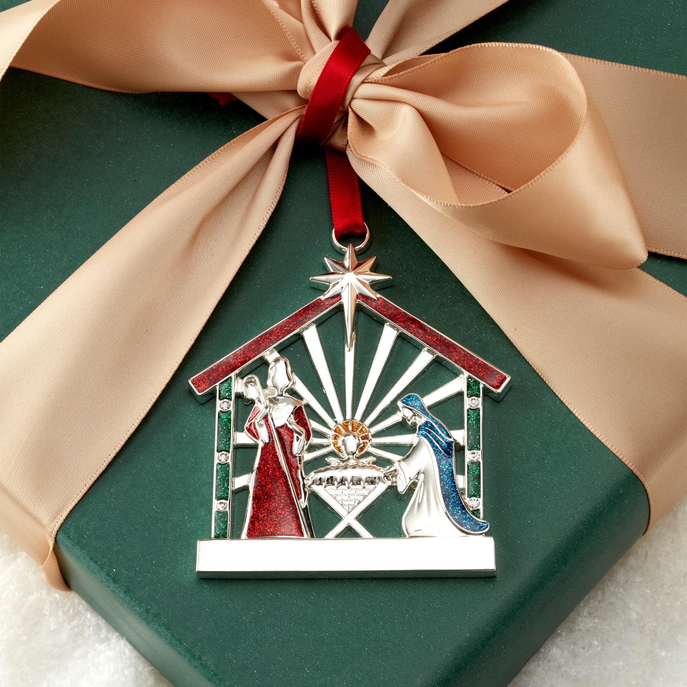 Bring the spirit of Christmas to life with this nativity scene. a stunning tribute to the season’s most cherished story. Crafted in gleaming silverplate. this ornament adds a touch of elegance and traditional charm to your tree. year after year.