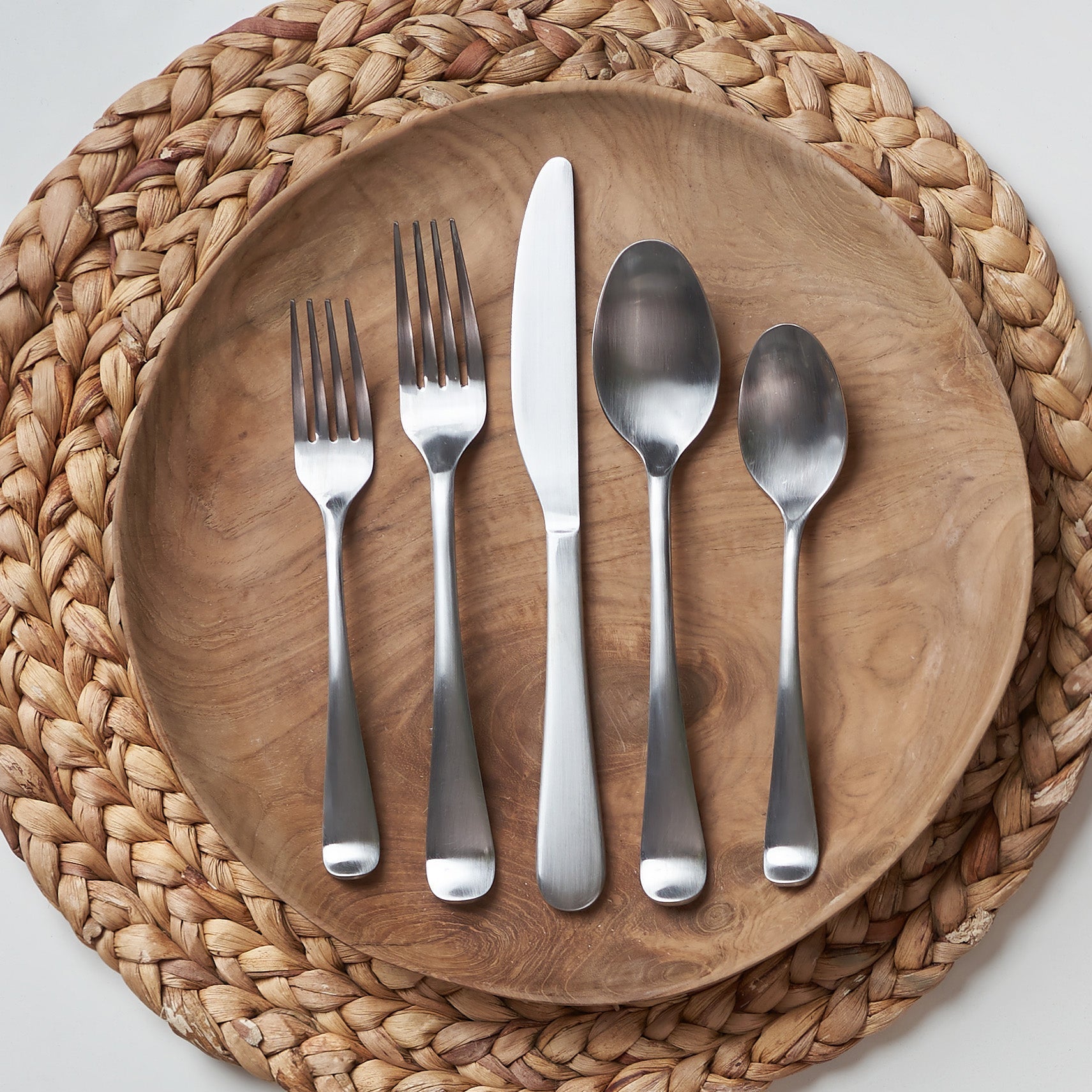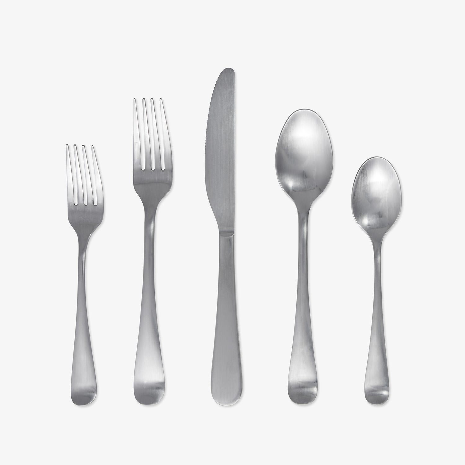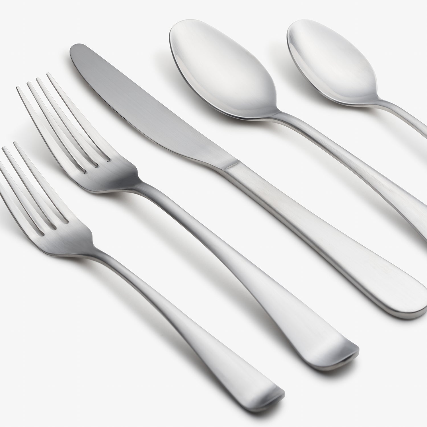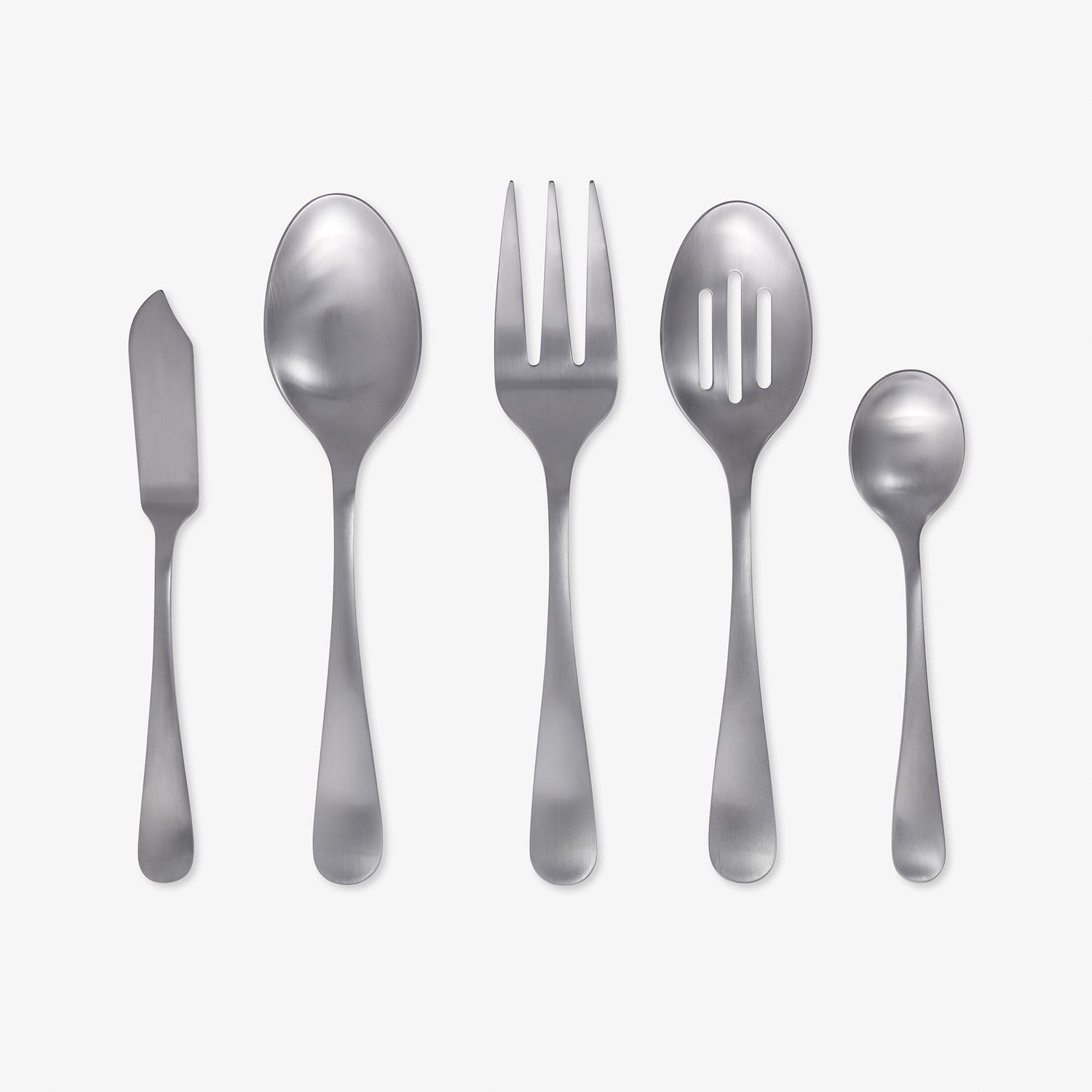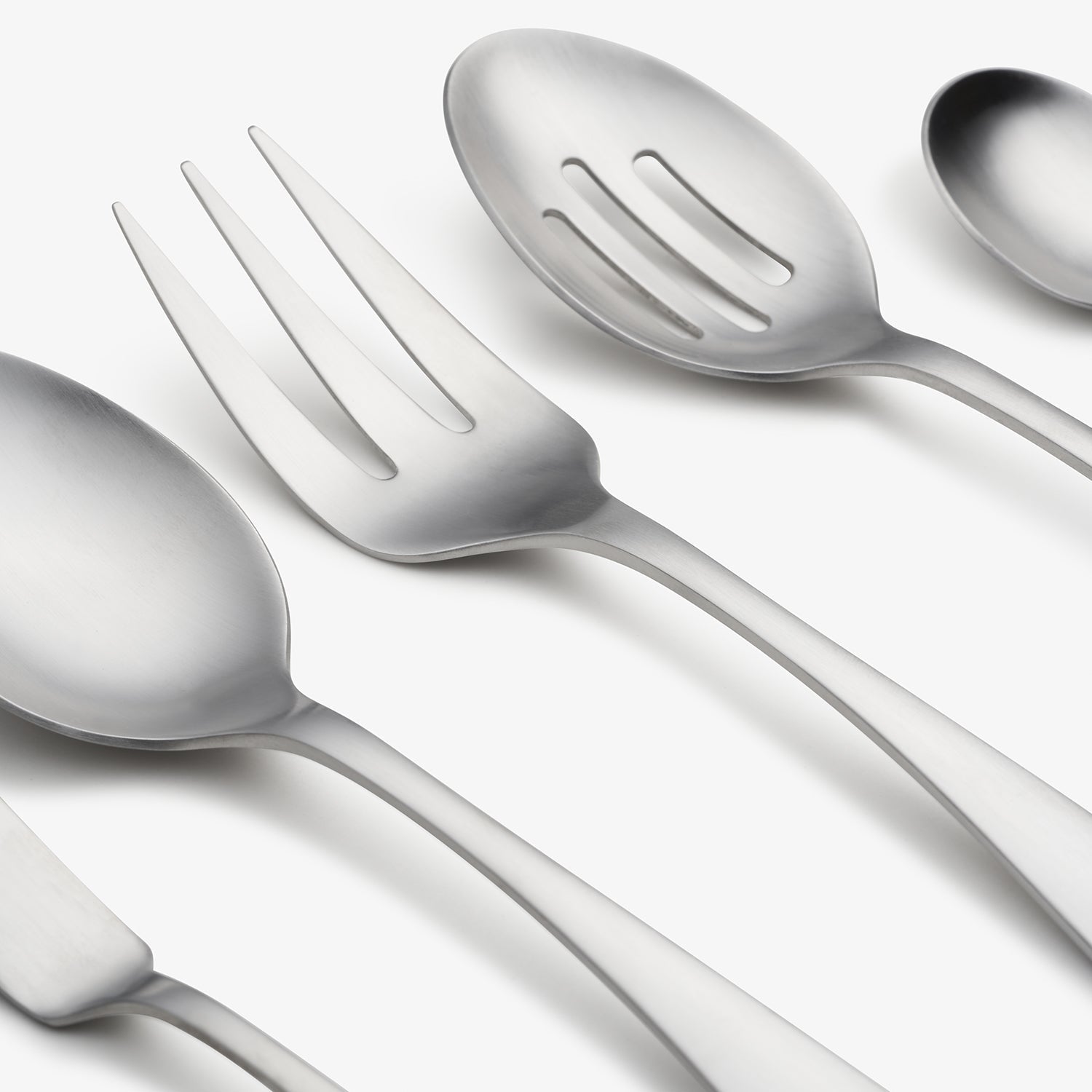 45-piece service for 8 with a comfortable and modern handle featuring a brushed. satin finish. This set includes a five matching serving pieces.